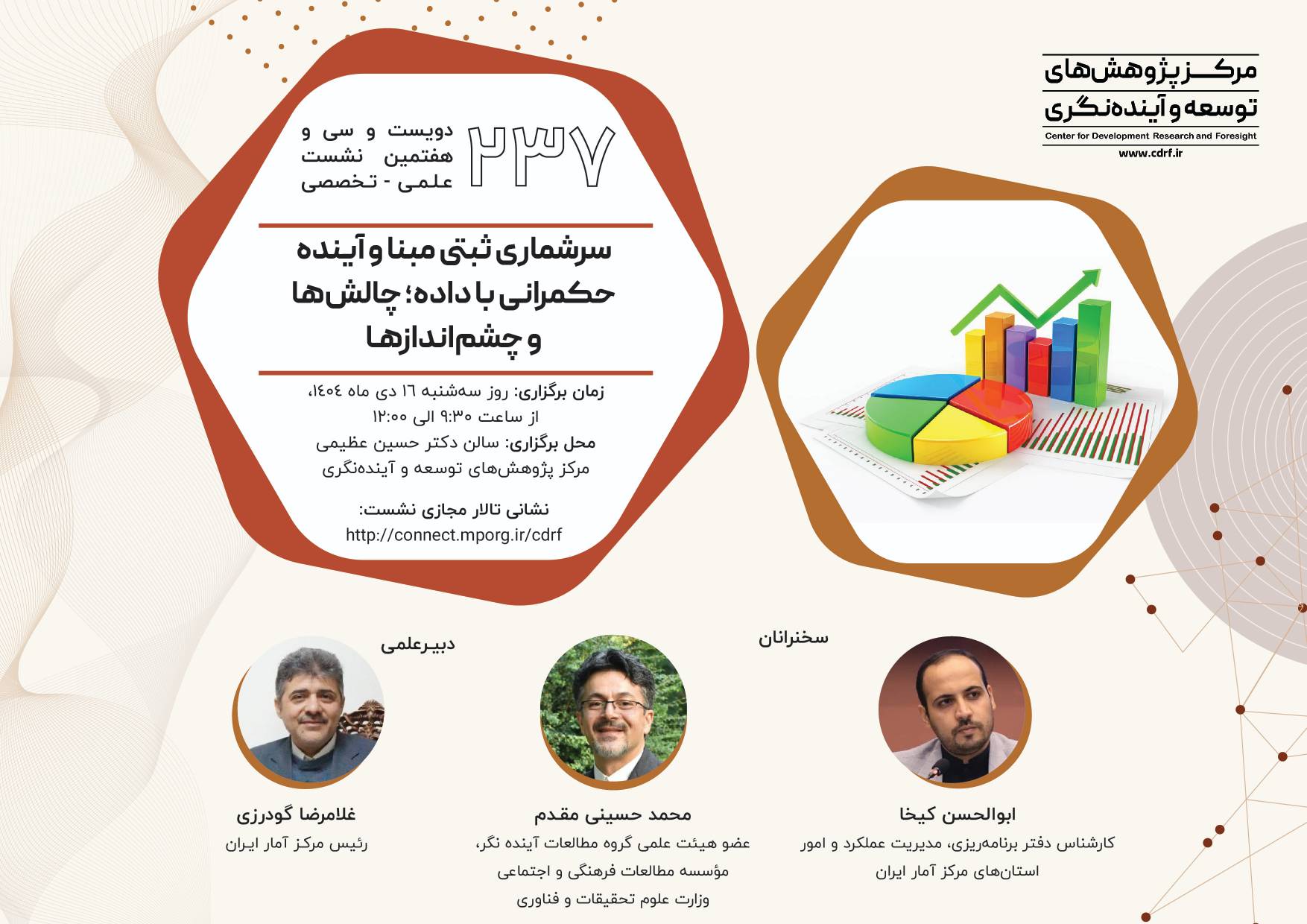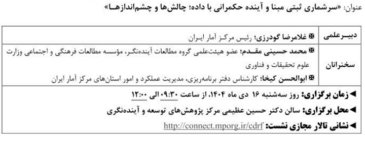 نشست علمی سرشماری ثبتی مبنا آینده حکمرانی با داده ۱۴ دی ۱۴۰۴ | ۱۰:۲۱ کد : ۵۷۴۱۸ اطلاعیه ارسال به دیگران نام شما ایمیل شما ایمیل دریافتکننده ارسال انصراف تعداد بازدید:۵۴۵ دویست وسی وهفتمین نشست علمی - تخصصی با عنوان سرشماری ثبتی مبنا آینده حکمرانی با داده، چالش ها وچشم اندازها